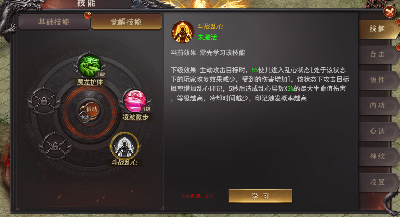 技能效果:主动攻击目标,概率触发乱心印记(目标恢复减少,受到伤害增加)持续5S,印记存在期间概率对目标增加乱心层数,结束后对目标造成层数X百分比目标最大生命值