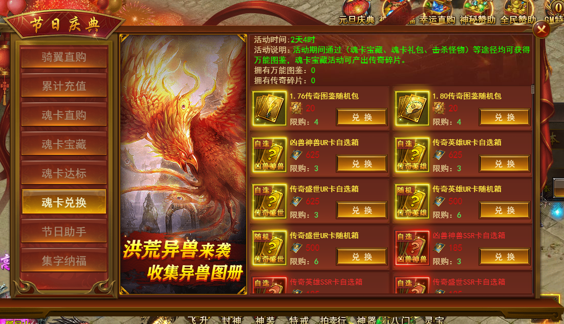 活动期间可通过魂卡宝藏获得大量传奇碎片和万能图鉴,兑换传奇魂卡。