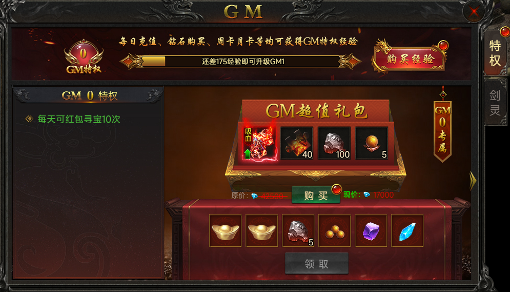 每日充值、钻石购买、周卡月卡等均可获得GM特权经验。升级GM特权等级,可获得对应等级GM特权和购买超值礼包。